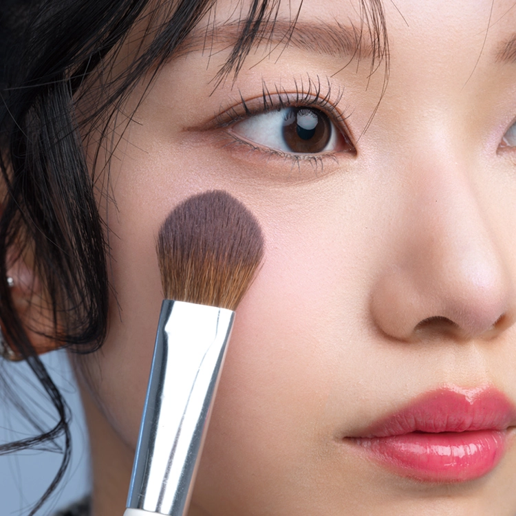 ほお骨の一番高さのある位置を起点にbを塗布。ブラシで目尻側から内に向かってトントンとぼかし広げる。cもブラシを使い、bの上に少しかかるようにほお骨の角にのせる。