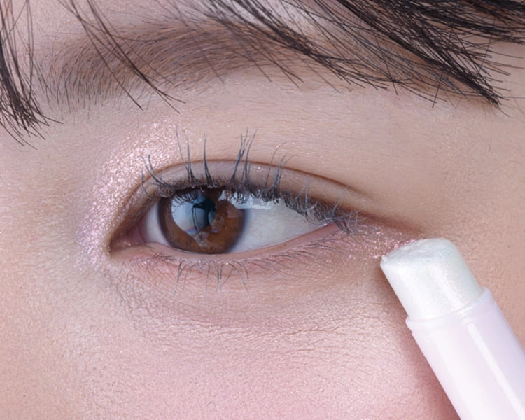 cを少量だけ指にとり、目のクマにかかるくらい高めの位置にトントンとのばす。塗る範囲は目頭下から黒目下まで。チークも中心寄りにのせて、デートの高揚感を表現♡