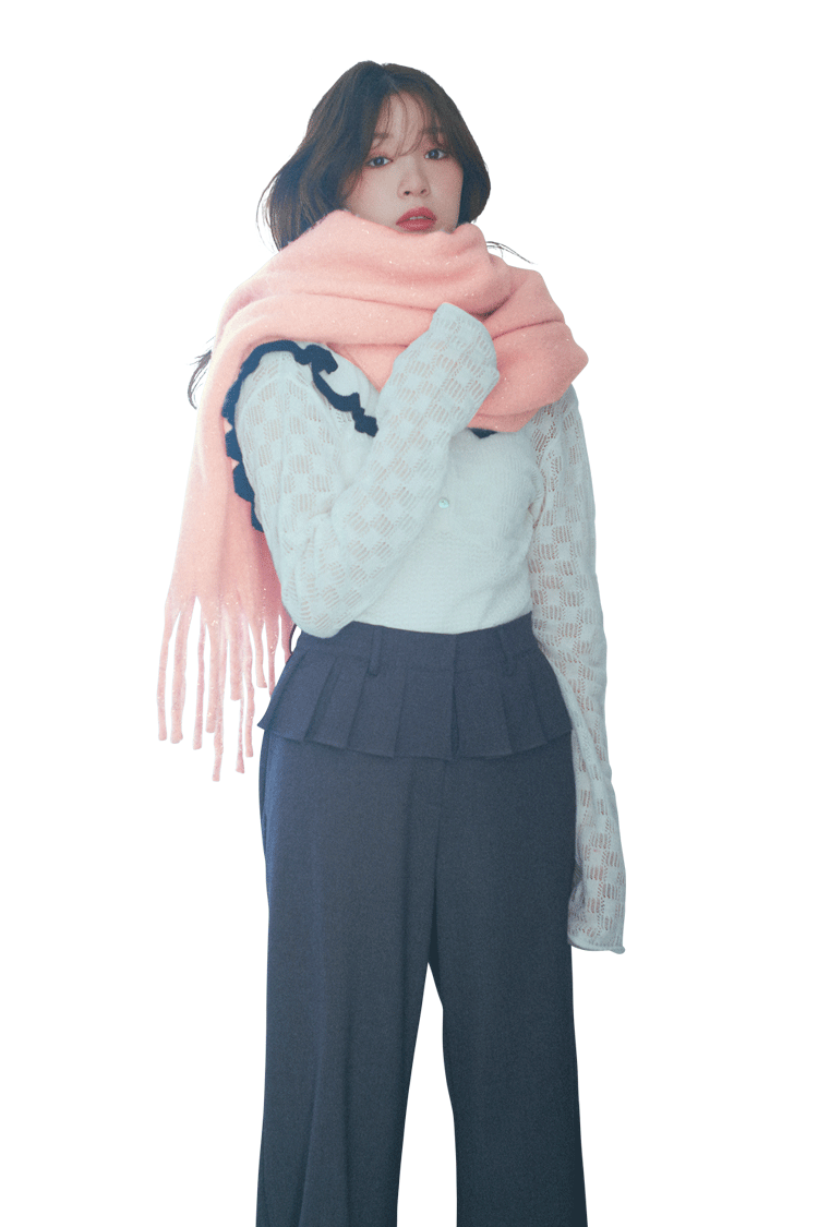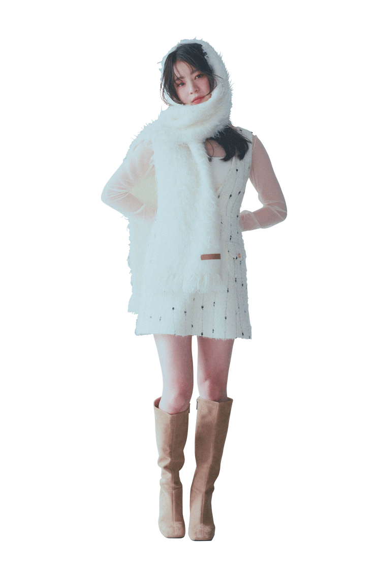 シアー×フリルの甘さに、色気は落ち着かせ、可愛さはプラスできるマフラーをオン。