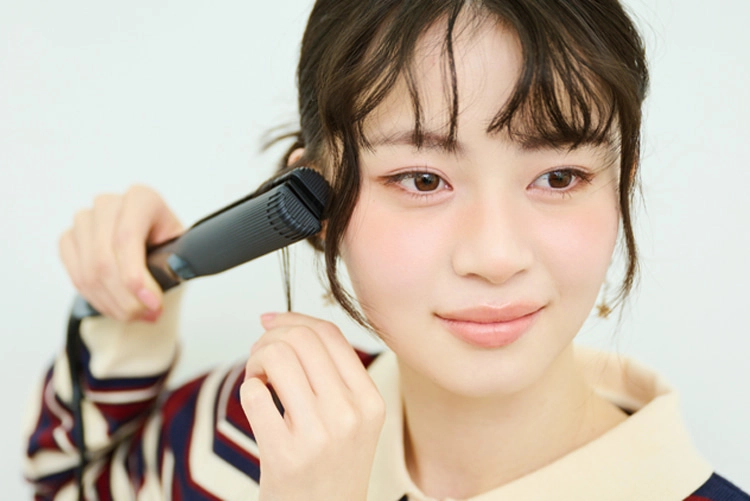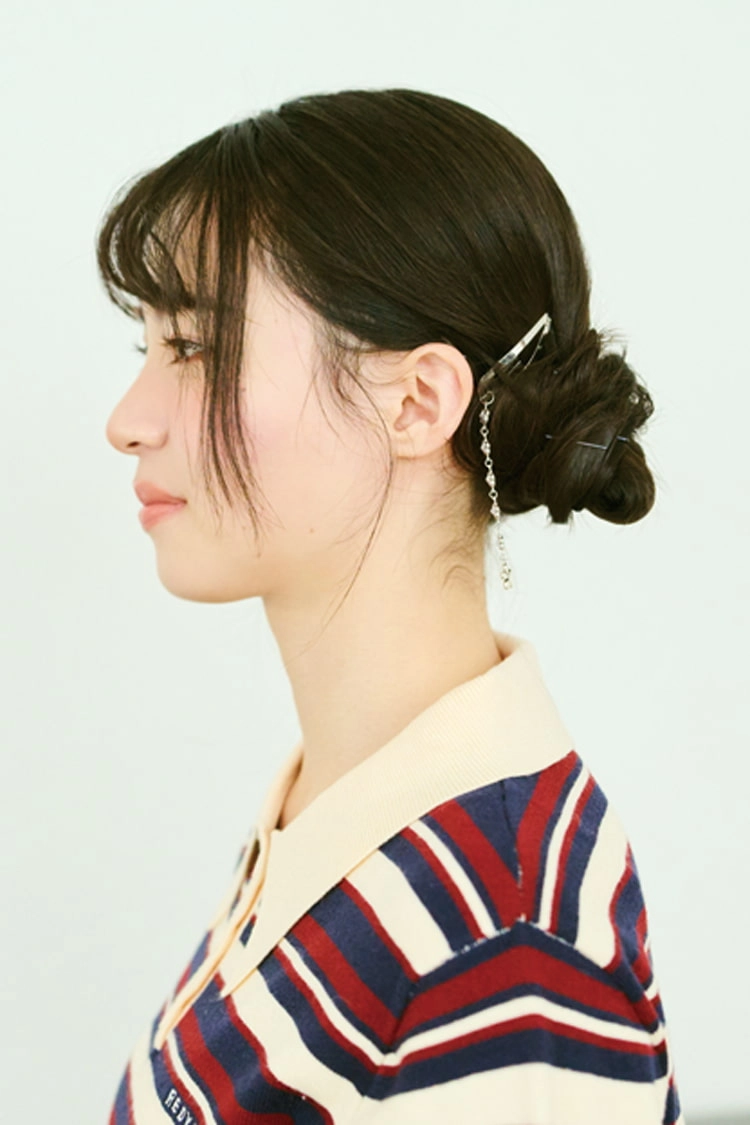 ストレートアイロンを使い、もみあげが短い場合はワンカール、長い場合はS字カールにする。顔まわりは毛先が内になるよう波巻きに。飾りピンは、おだんご上の耳後ろにつける。