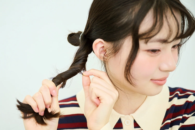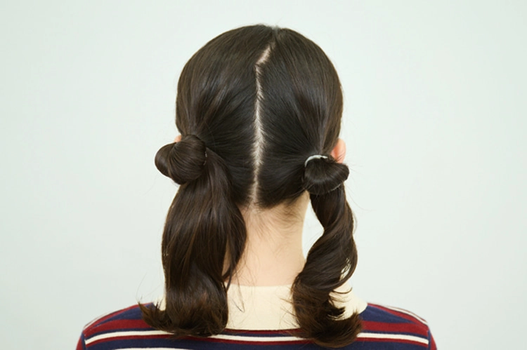 全体の髪を中央で左右2つに分け、耳の横より少し内側で結ぶ。そのとき、毛先を出した小さいおだんごにする。アイロンがある場合は、毛先に少しカールをつくるとおだんごにしやすい。