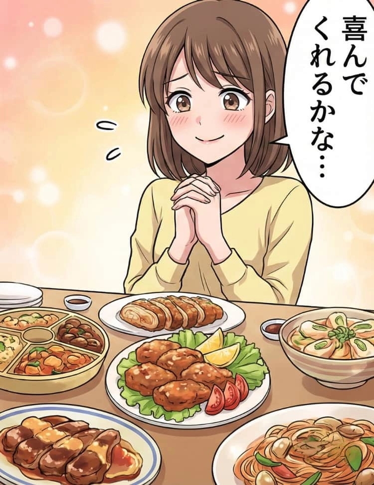 「これならきっと喜んでくれるはず」「おいしいと言ってくれるかな」と、彼の笑顔を想像しながらキッチンに立つ時間は、私にとっても幸せなひとときでした。愛情をたっぷりと込めて食卓に並べました。