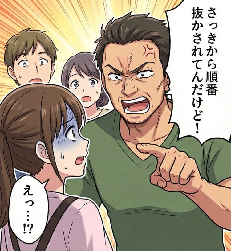 「ちょっと!さっきから順番抜かされてんだけど!」男性はものすごい剣幕で私を睨みつけ、怒りをあらわにしていました。私は「えっ?」と驚き、恐怖心を隠し切れませんでした。