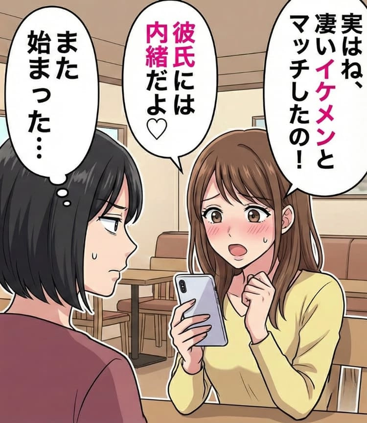しかも、最近マッチした男性が信じられないほどのイケメンで、すっかり夢中になっているとうれしそうに語り始めました。私は彼氏への罪悪感はないのかと呆れましたが、彼女は悪びれる様子もなく、ただ浮かれきった様子でスマホの画面を見せてきました。