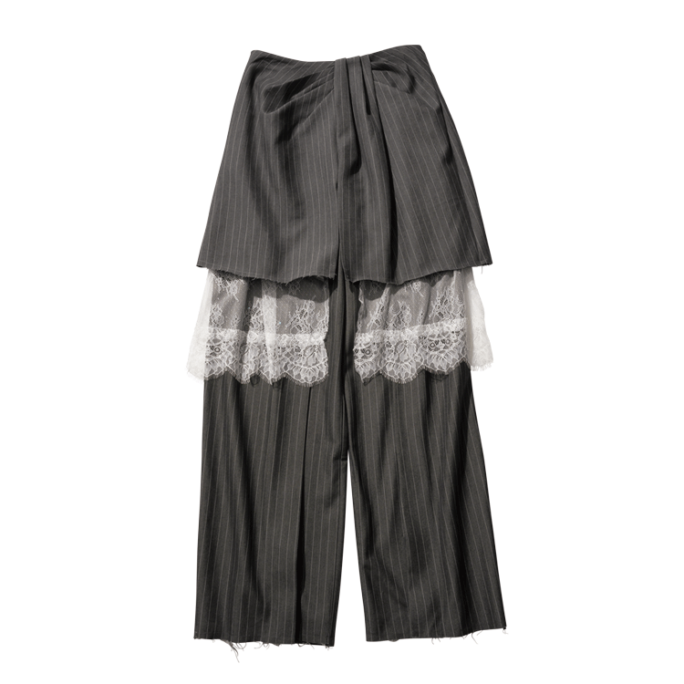 2枚のスカートとパンツの3点で構成されたセットボトムは着回しバリエが無限大。クールな印象のピンストライプと繊細なレースの組みあわせは上品かつ色気もある、まさにイイ女服。