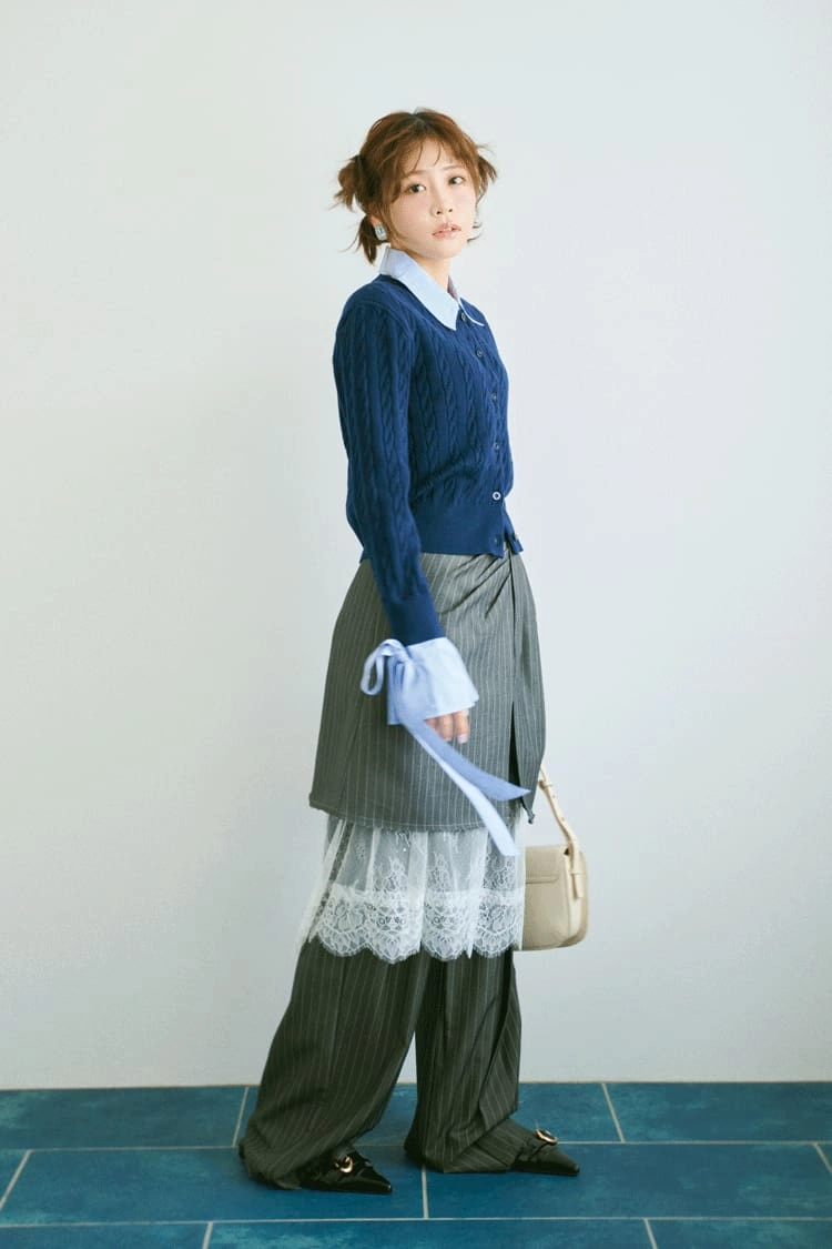 プレイフルなボトムは品行方正なネイビーニットで落ち着かせて。フリルやレース、リボン、細部に甘さを宿した着こなしで自分らしさをアピール。