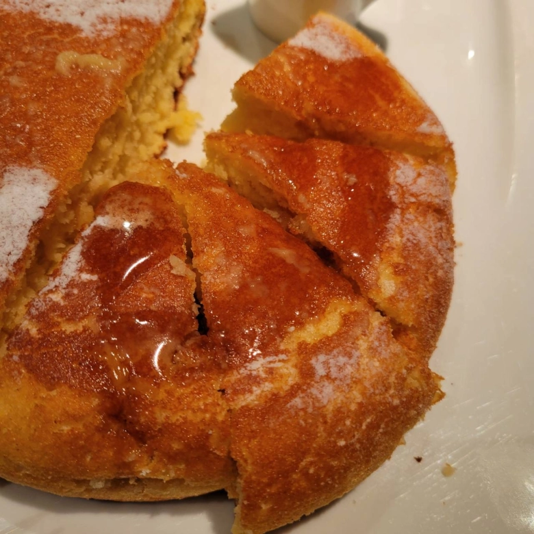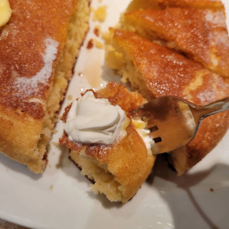 食べてみると、生地はしっとりしていて、バニラ感はなく、甘さ控えめで、シンプルなお味でした。なぜか、懐かしい気持ちになれ、ホッとするパンケーキでした。
