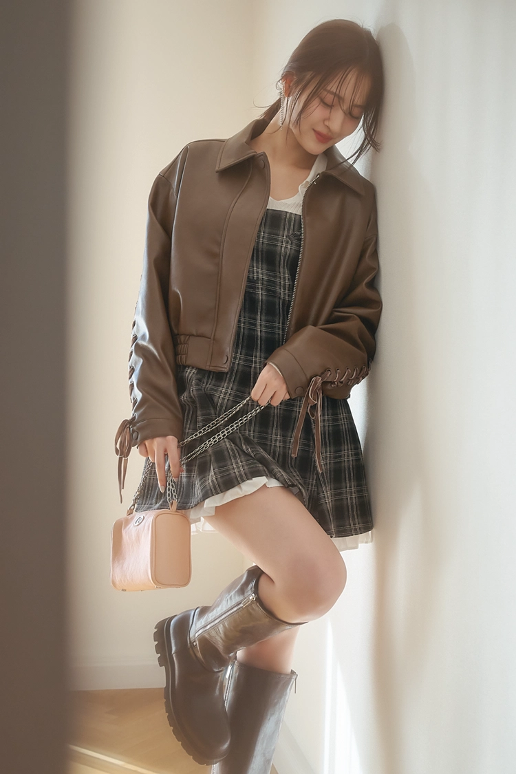 そのフリルデザインにときめく、好感チェックワンピ。さらっとした白のトップスをINして甘すぎない組みあわせにしつつ、アウターは旬のブラウンレザーで辛めに。