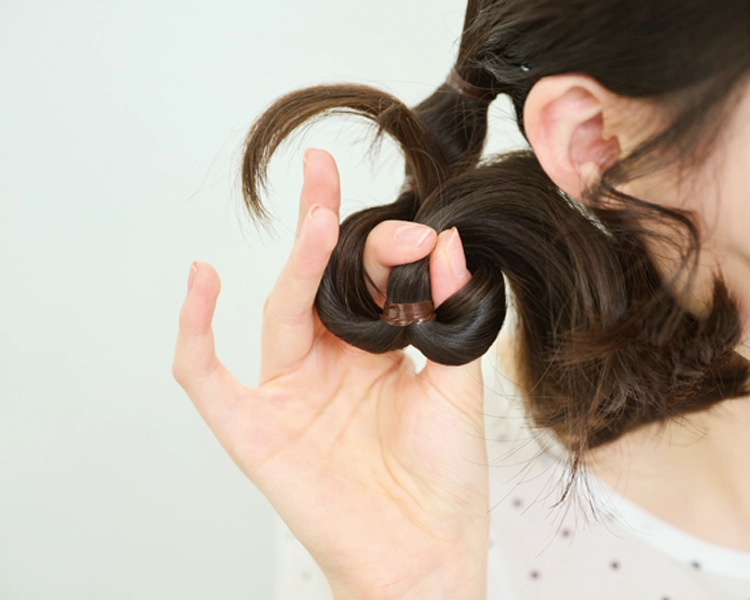 How to 2でつくった結び目の下にゴムをななめに結び、毛先が5cm程度残るまで繰り返し、ゴムの間を引き出す。もう一方も同様に結ぶ。左右のバランスを見てひっぱり出す位置、量を調整して。