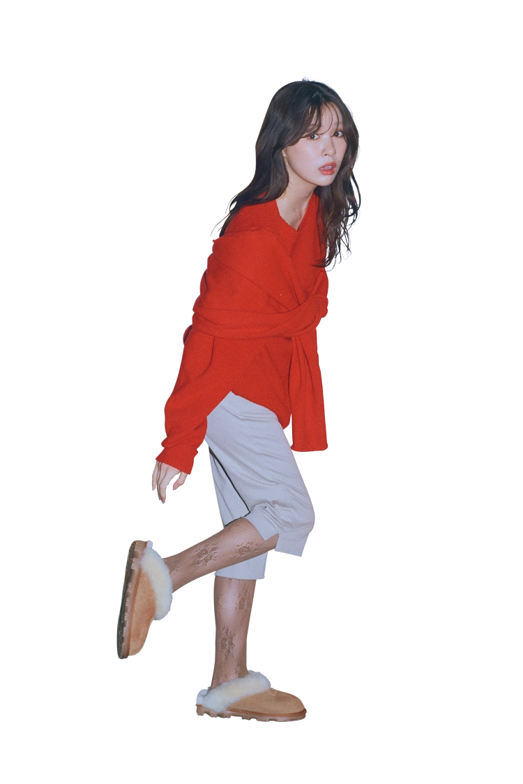 Cordinateムートンシューズのラフさをムーディな赤で中和させて