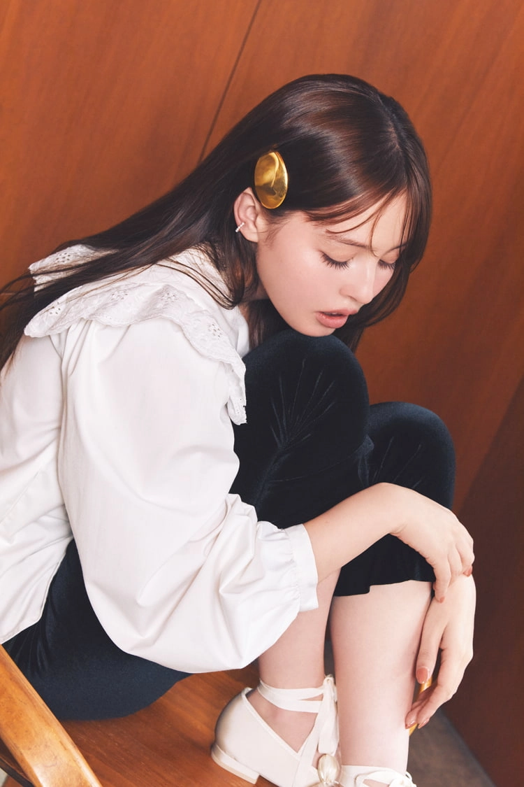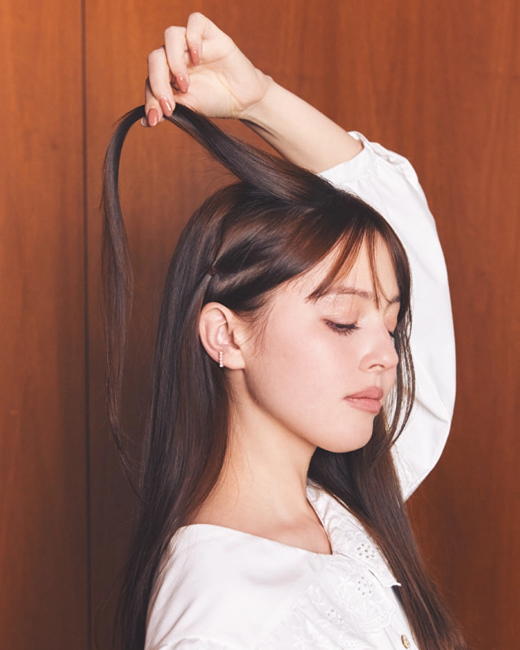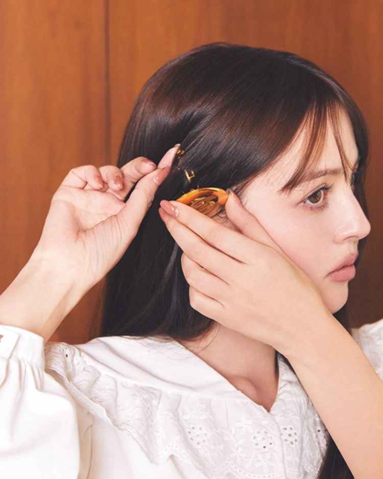クラシカルな白ブラウスには、清楚なストレートヘアがお似あい。コーデに華を添える大きめバレッタは、パチンととめるだけでも成立するけど、仕上がりがよりきれいに&一日中くずれないための1テクを加えてみて。