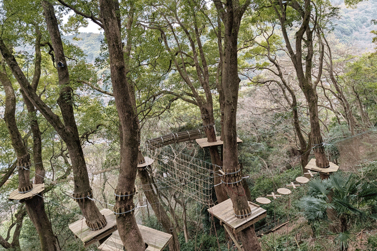 「森の空中基地 くすくす」は、アフタヌーンティーも楽しめるツリーハウスのほか、樹上アスレチック「森の空中散歩」が楽しめます。