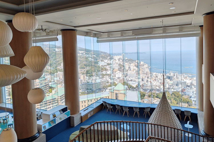 「リゾナーレ熱海」に入ると、まず目を奪われるのが、高さ約6メートルの大きな窓。熱海の海と街、そして空のまさに絶景。