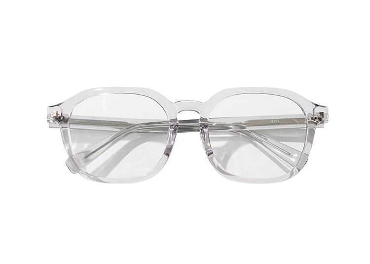 引き締まった黒フレームだとキツく見えがちなコも、クリアならやわらかい印象に。