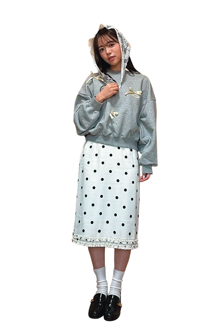 「ドット柄とレースで、ウィッシュコアな雰囲気を演出しました。スエットのイエローリボンで春のトレンドカラーも意識」