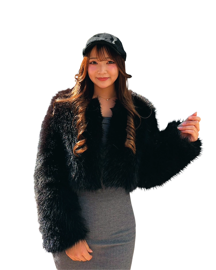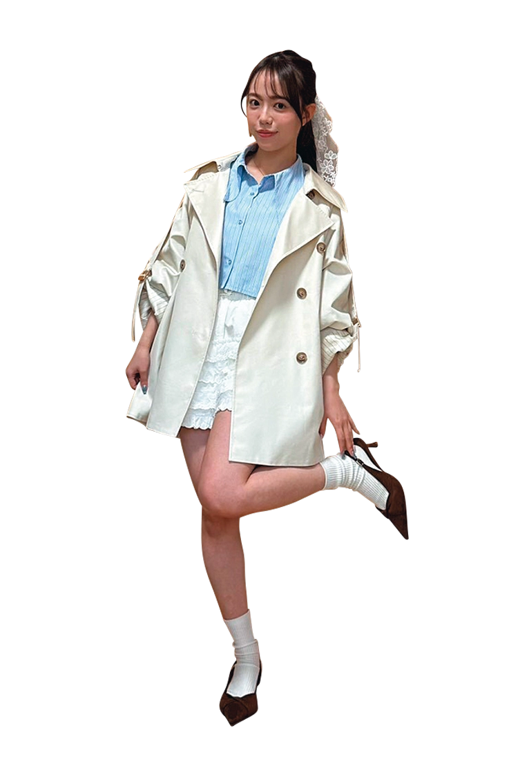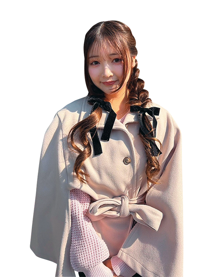 「甘さはあるけど、子どもっぽくなりすぎないように、チークでほんのり血色感を出しつつ、ベースメイクはセミマットに。くすみピンクのケープコートで、フレンチっぽさを演出しました」