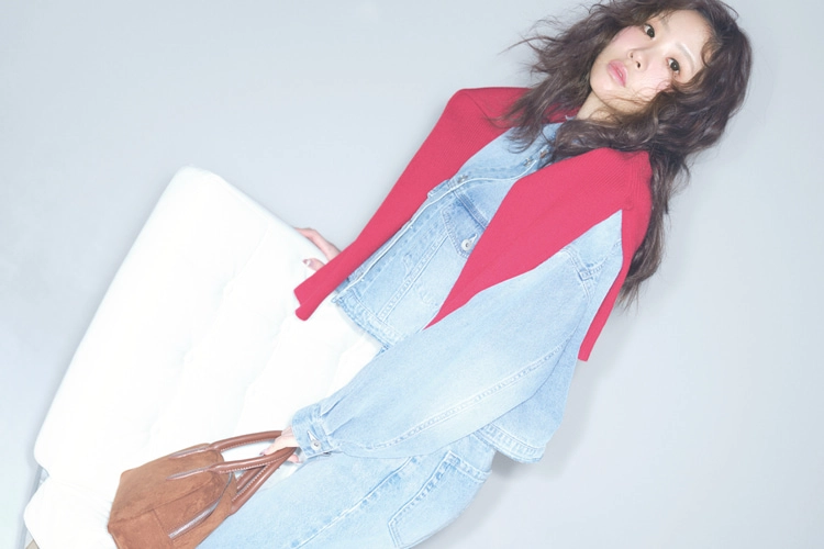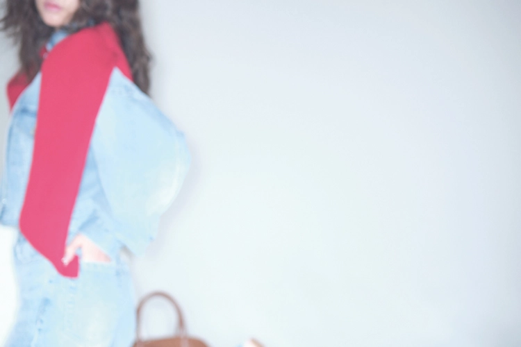 Cordinateデニムと相性抜群の赤を肩がけして印象チェンジ