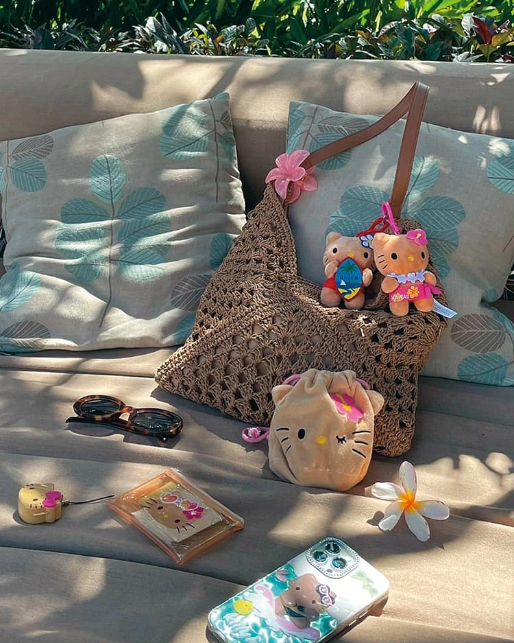 「ハワイやグアムなど、南国旅行用のバッグに日焼けキティをつけてみました。チャームだけでは物足りず、巾着やスマホケースまで現地のABCマートで爆買い♡ ハイビスカスのクリップもつけて、南国感満載のバッグの完成!」