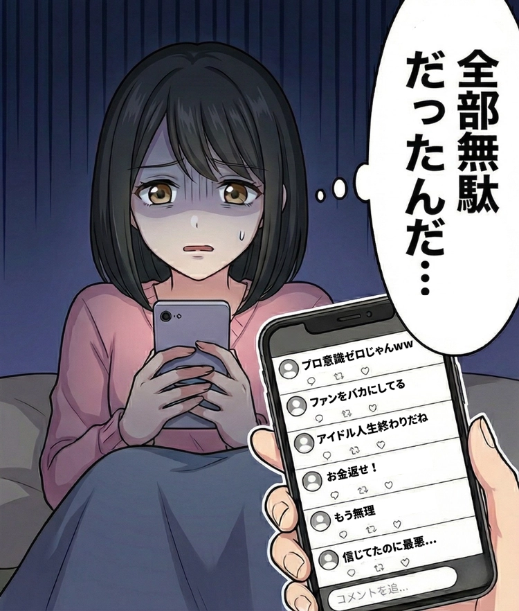 「これがプロ意識?」「ファンをバカにしてる」といった批判が殺到し、私もようやく現実を受け止めることになりました。これまで信じて応援してきた時間も、お金も、気持ちも、すべてが無駄だったのだと。