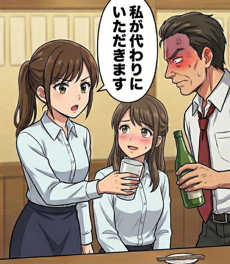 まわりも止められず、後輩は今にも泣きそうな状態に。その姿を見た瞬間、私は席を立ちました。「私が代わりにいただきます」と言ってグラスを受け取り、一気に飲み干します。