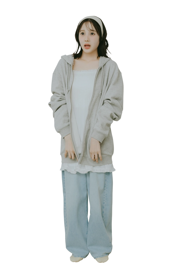 おおきめパーカ&ストレートデニムのゆるっと感が、守ってあげたくなるピュアな可愛さに。レースのキャミワンピをあわせて、シンプルすぎるコーデに甘さを♡