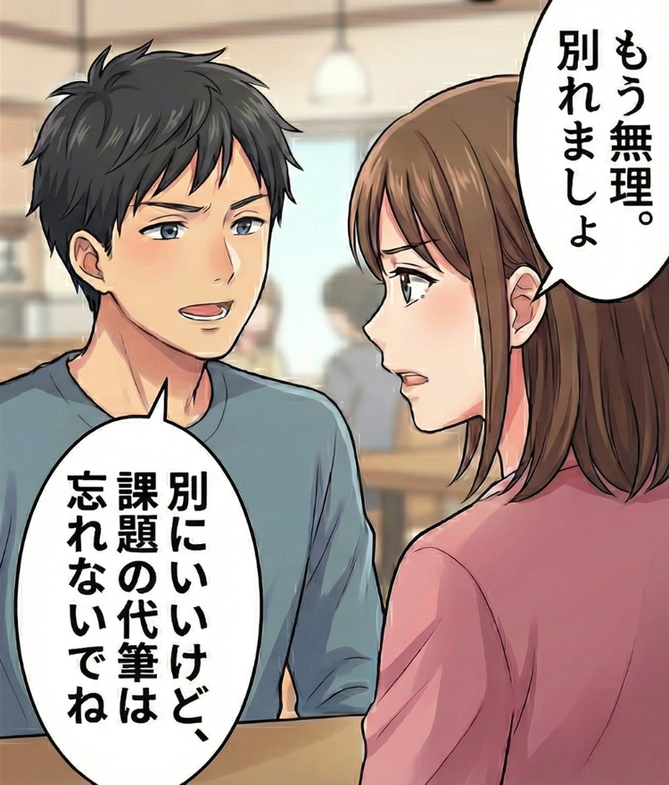 「別れるのはいいけど、俺が休んだ分のノートと課題の代筆は忘れないでね。単位落とせないし」と最後まで、私の気持ちは一切考えていませんでした。