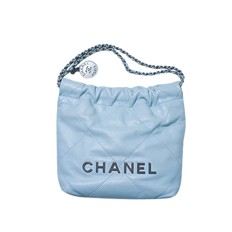 「CHANELのミニハンドバッグ。パステルブルーがお気に入り。色みとチェーンのデザインが相まって、どんなコーデでもガーリーな印象になるんです」