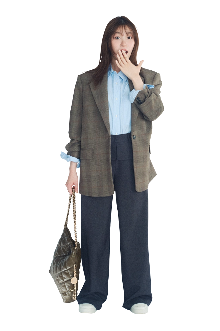 チェックジャケットは着回し。ブルーシャツ 3,990円/UNIQLO フリルつきスラックス 15,955円/ROSE FRANTZ(HANA SHOWROOM)バッグ 8,998円/SLY(バロックジャパン リミテッド)スニーカー 17,600円/プラス ダイアナ(ダイアナ 銀座本店)