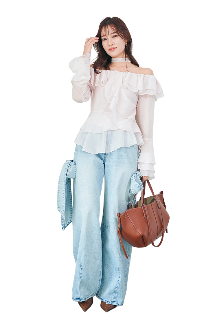 「オフショルトップスとデニムは、SSの新作です。カジュアルなデニムにシアーのオフショルで女性らしさを演出しました」