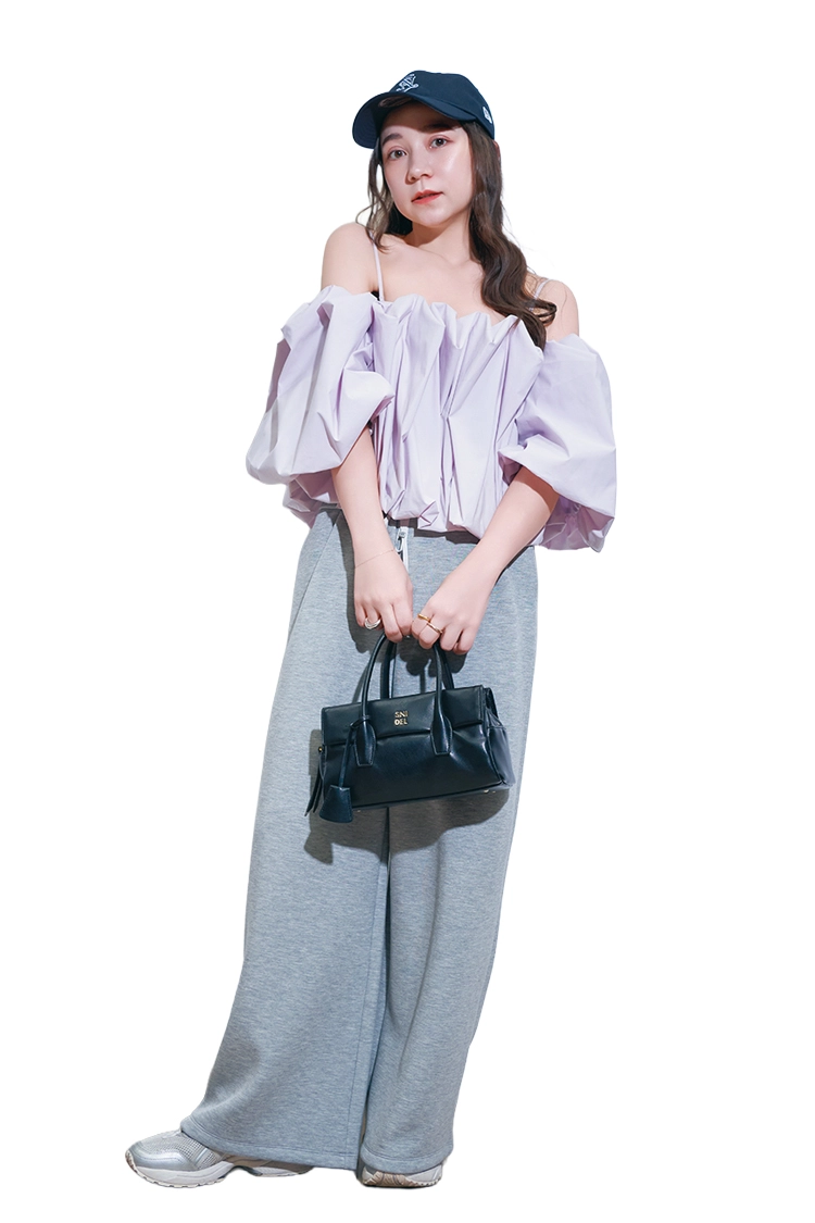 「スエットパンツとスニーカーでラフなスタイリングに。カジュアルすぎないようにオフショルトップスで女みもプラス」