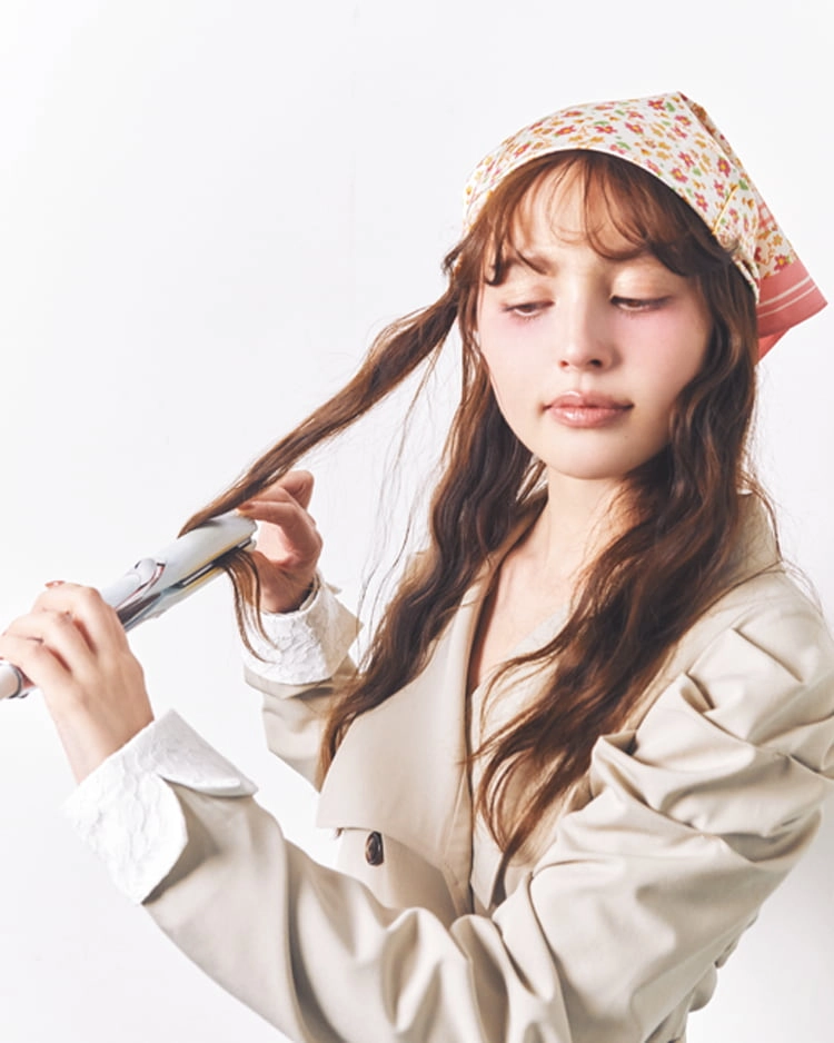 スカーフで覆われる部分は、カールをつけないほうがすっきり見えるので、巻くのはスカーフを装着してから。スカーフから出た髪をストレートアイロンでウエーブ巻きに。前髪も毛先をくるんとさせて。