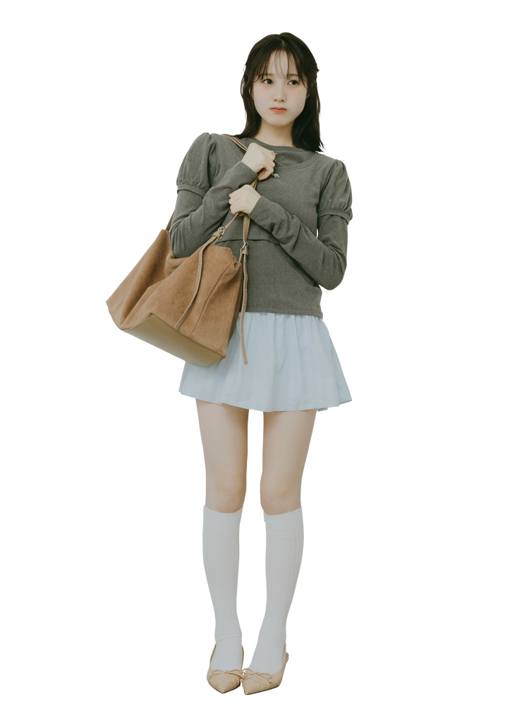グレーのトップスやスエードバッグをあわせた、トレンド感満載な春コーデ。ハイソックスで脚長効果を狙える。