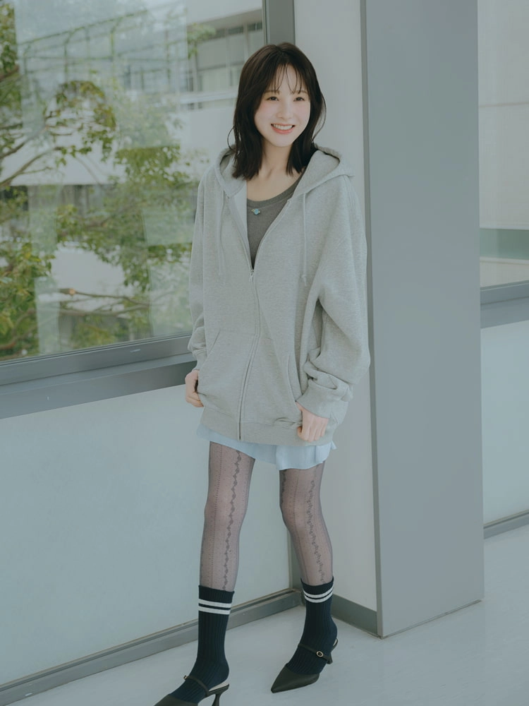 ジップフーディのグレー×ミニスカのブルーが相性抜群。ラフさのあるアイテムのなかに、レースを仕込めば女のコらしさもキープできる♡