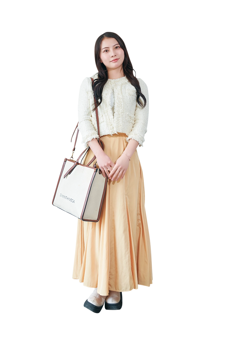 「爽やかなパステルカラーのスカートとツイードジャケットで春らしいコーデに。全体的にキレイめを意識しました」