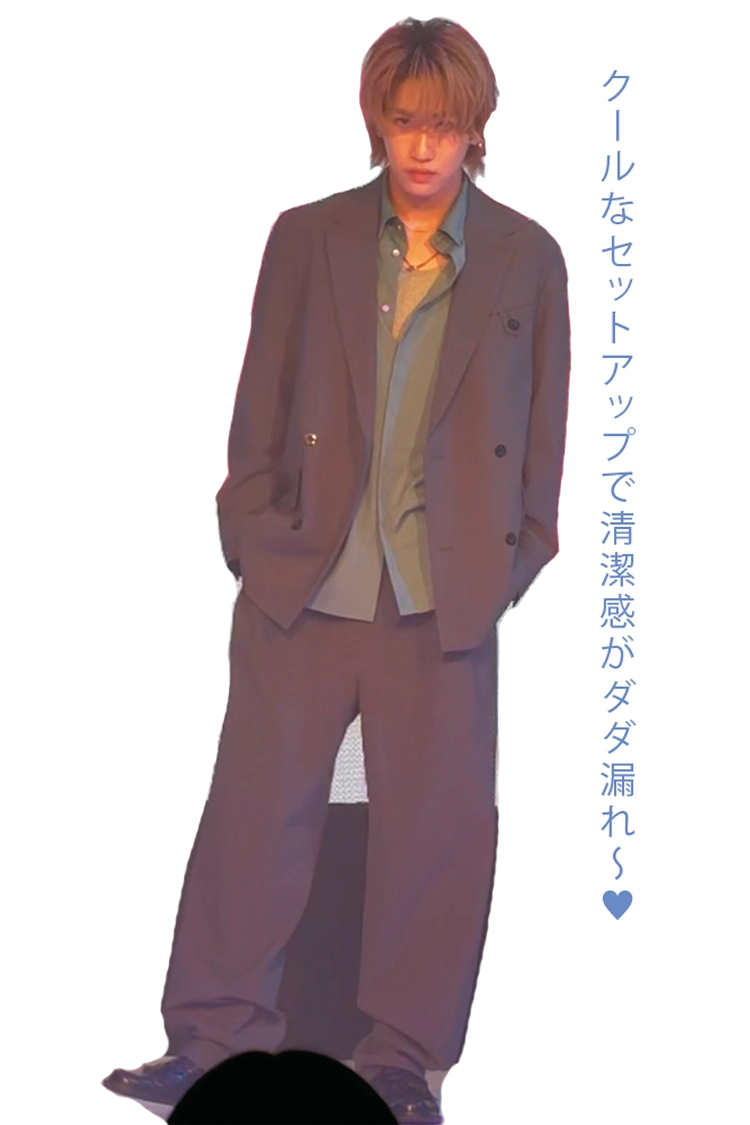 〈福澤〉ジャケット 71,500円、ワイドパンツ 46,200円、シャツ 29,700円/以上CULLN(I シアンPR)タンクトップ 2,200円/Hanes(ヘインズジャパン)ローファー 16,500円/原宿シカゴ 原宿店 チェーンネックレス 3,300円/LION HEART(シアン PR)ネックレス/スタイリスト私物