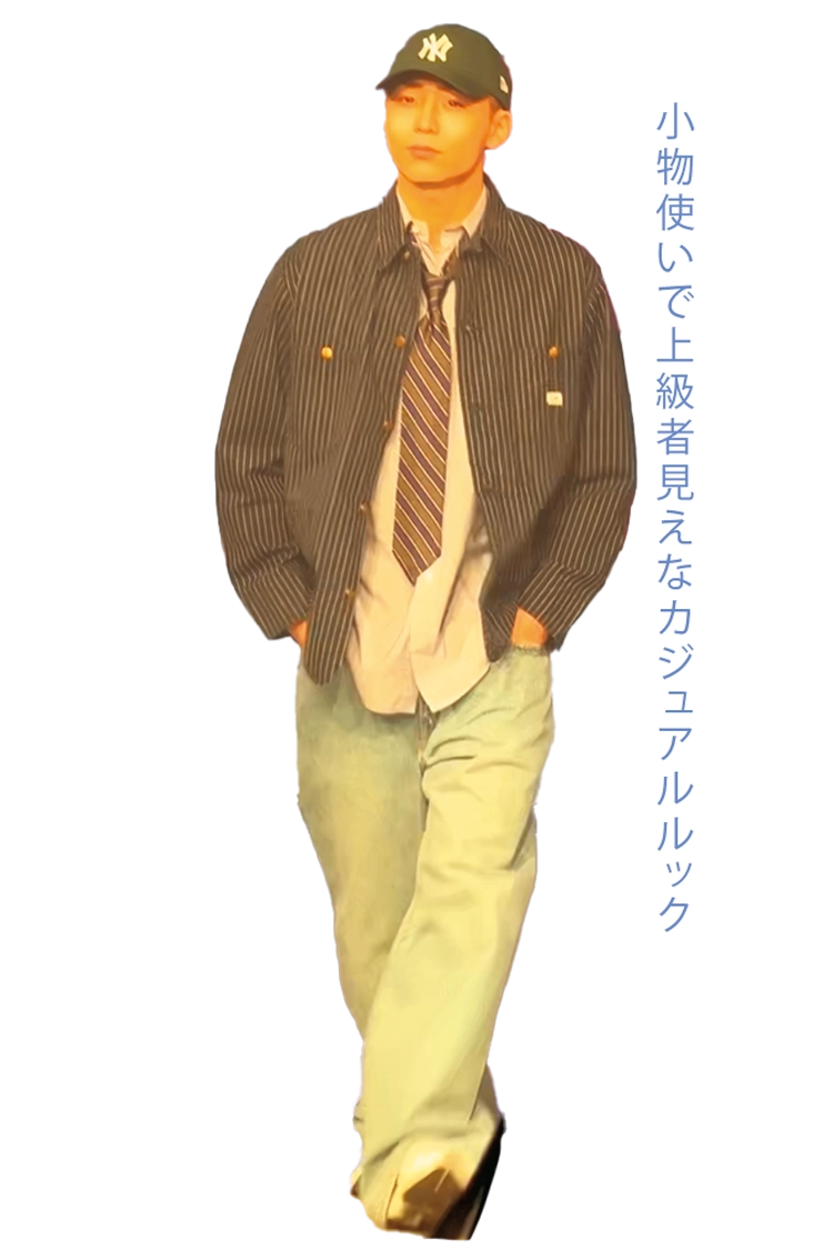 〈八村〉ストライプシャツ 7,150円、ネクタイ 4,290円/ともに原宿シカゴ 原宿店 ストライプジャケット 18,700円/Lee、デニムパンツ 15,400円/EDWIN(ともにエドウイン)キャップ 4,620円/New Era® スニーカー 19,800円/New Balance(ニューバランスジャパン)