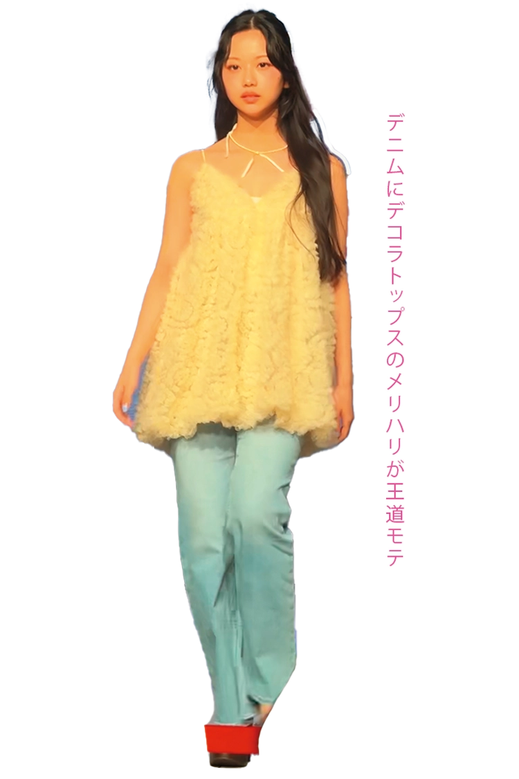 〈琉〉チュールミニドレス 11,500円/NOTRE émo(r SORA)デニムパンツ 12,100円/COCO DEAL(ココ ディール)リボンバレッタ 550円/PHILLY ネックレス 2,200円/I AM THE 1(レイジーワークス)サンダル 15,990円/ZARA(ザラ)