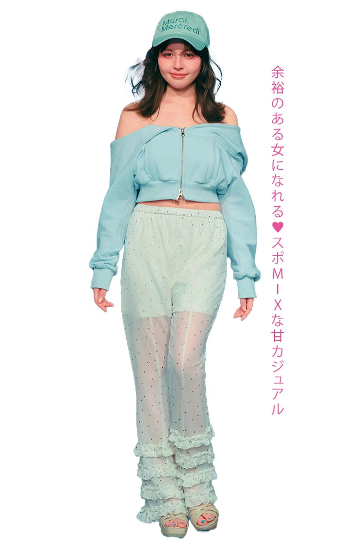 〈ナナ〉オフショルパーカ 15,180円/lilLilly(lilLilly TOKYO)ドットシアーパンツ 9,790円/être loin キャップ 6,050円/Mardi Mercred(i MARDI MERCREDI JAPAN)サンダル 14,300円/rienda(バロックジャパンリミテッド)