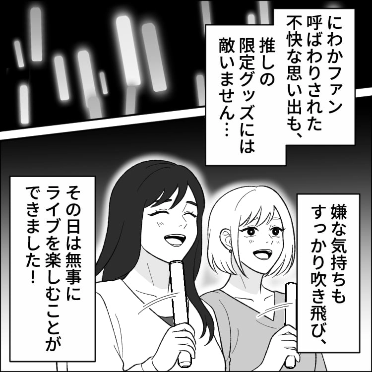 【推し活】「にわかファンは後ろに下がりなよ」グッズ列に並んでいたら割り込まれた!?その後、警備員が来て【予想外の事態】に...! COMIC2026/04/17今回、Ray WEB編集部は、ライブ会場にいた迷惑なファンについて読者に話を聞いて漫画にしてみました。原案:Ray WEB編集部作画:ほや助あわせて読みたい2026/04/14友だちと食事と言ったのに、束縛彼氏が電話をしてきて...限界がきた主人公は【衝撃発言】を!?・前編ライターRay WEB編集部1…567人気の漫画一覧はこちら#TAG#漫画SHARE
