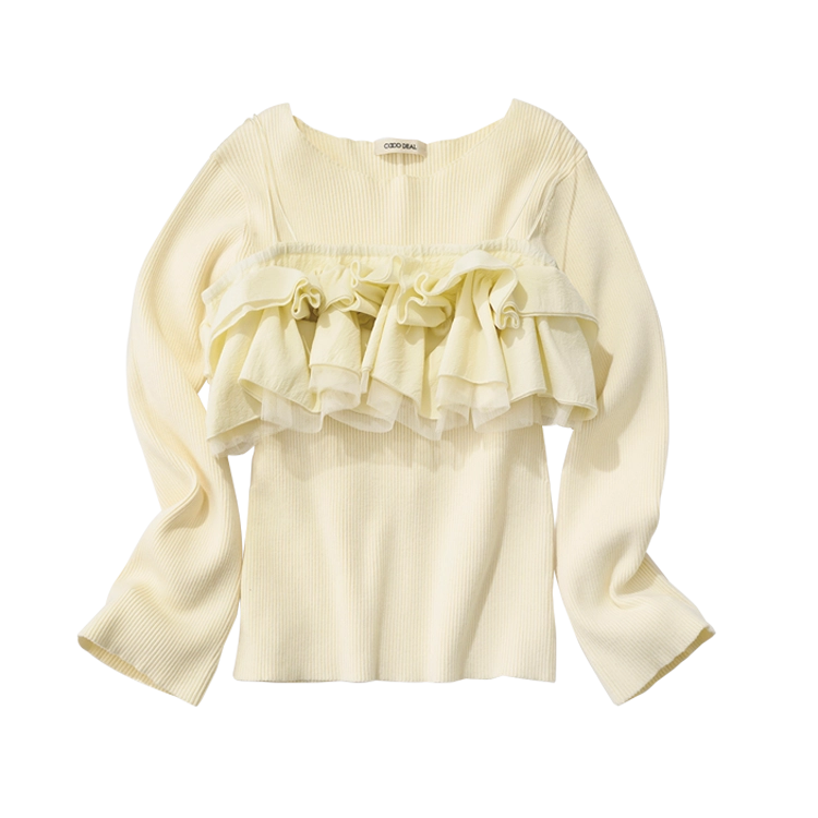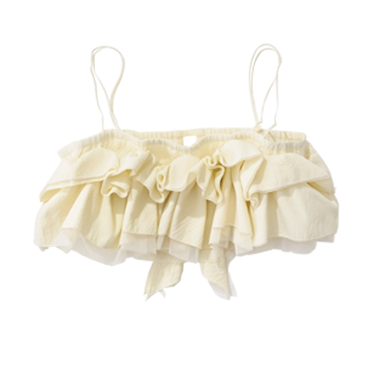 着回しに欠かせない、万能トップス。フリルたっぷりのビスチエは、どんなコーデにあわせても甘さをプラスできるから、使い勝手抜群。