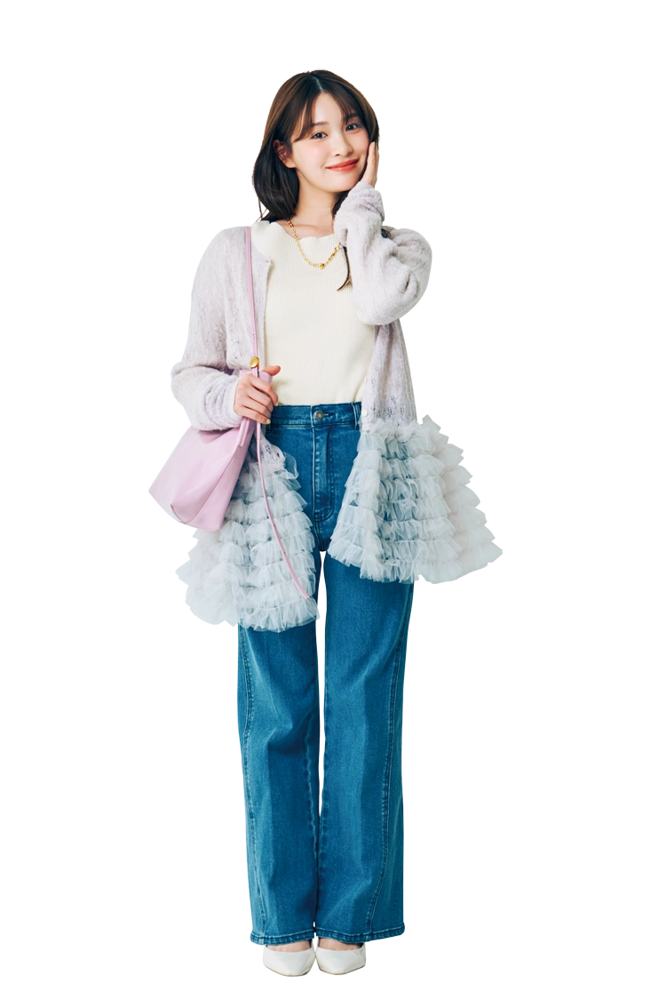 スタイルアップ効果抜群なフレアーデニムパンツをあわせたオトナコーデ。カーディガンのチュールやシューズを白にすることで統一感も◎。