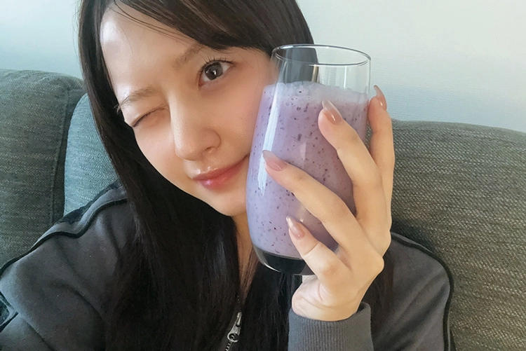 「毎朝スムージーを飲んでいます。ヨーグルト、低脂肪ミルク、バナナ、ブルーベリー、蜂蜜を入れてミックス。おいしくて、お腹にたまるので1日の始まりに幸せを感じています♡」