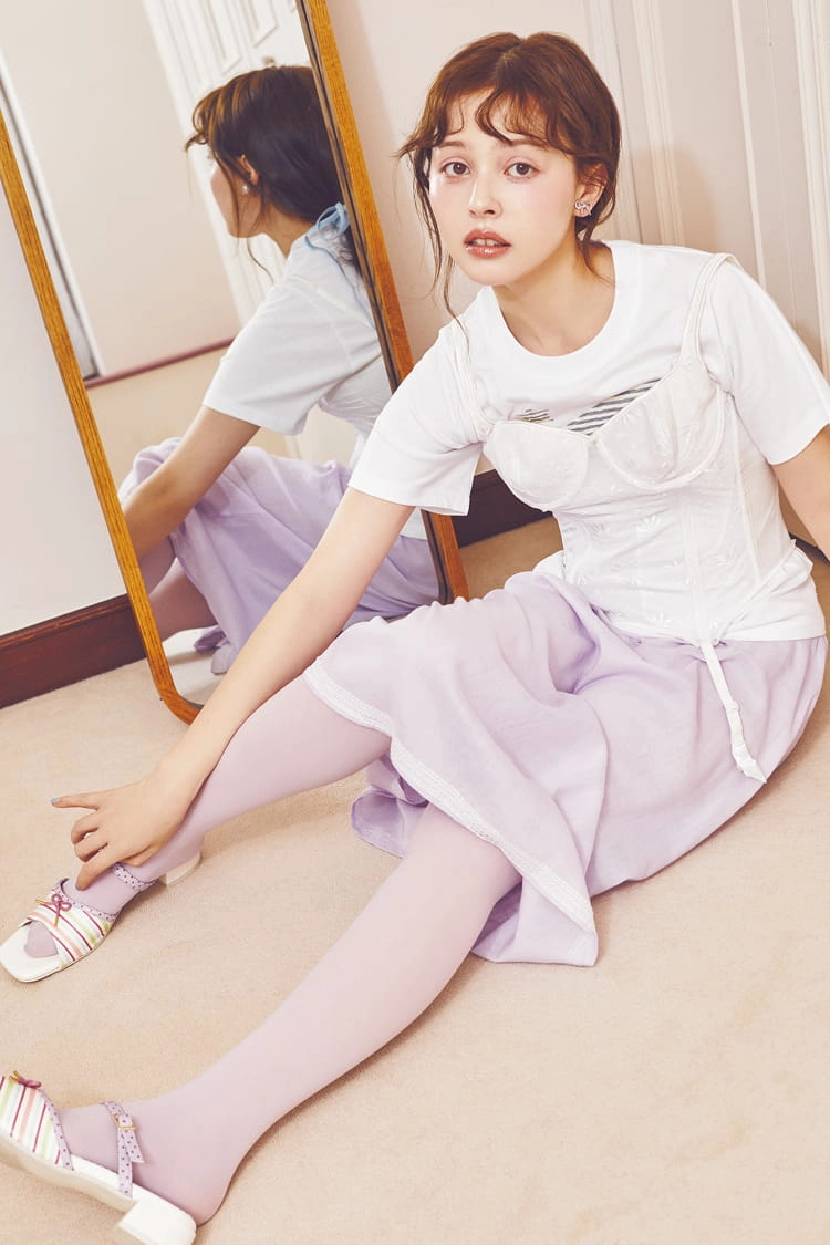 コルセットを自然に着るならTシャツの上に重ねて。文学少女のような上品な装いでミーハーな韓国ガールを彷彿させる♡