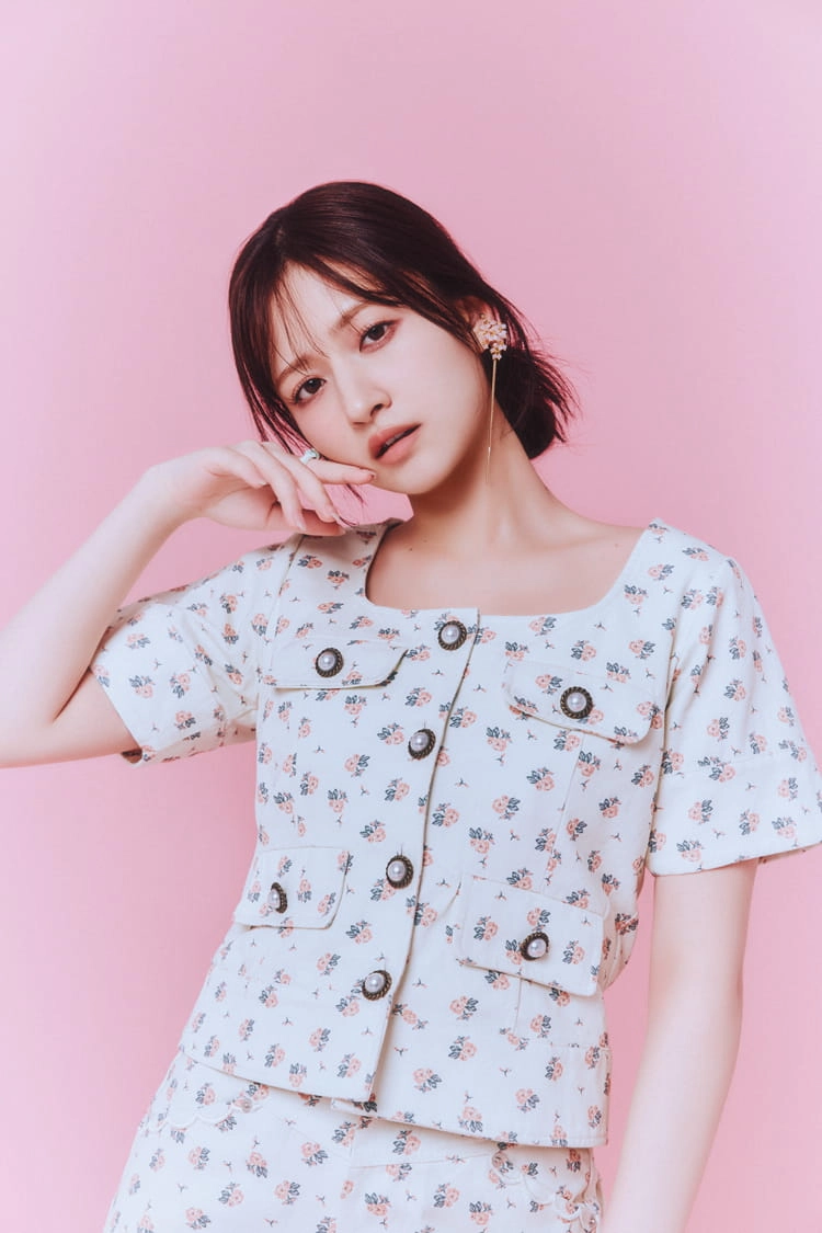 スクエアネックでシャープな印象に。白ベースのガーリーな花柄トップスも、大きめボタンのあしらいでグッと引き締まる。