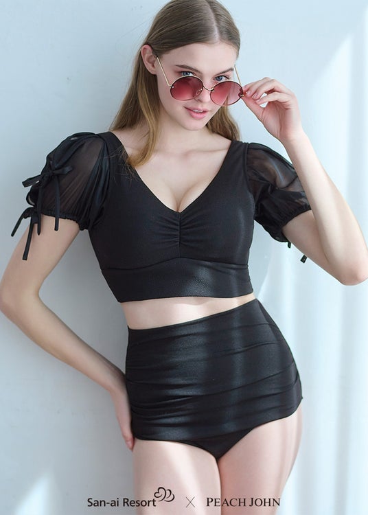 【San-ai Resort x PEACH JOHN ナイスバディ水着】フェミニンな印象をプラス(ハート)ハイウエストボトムタイプの「ナイスバディ水着 パフスリーブワイヤービキニ」