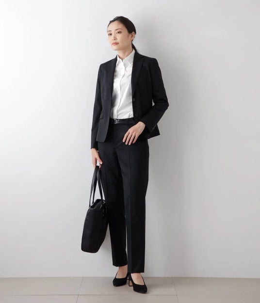 就職活動の王道と言えば黒の無地スーツ。インナーは襟付きの白シャツを合わせましょう。ベルトやバッグ、シューズもブラックで統一するのがポイント。