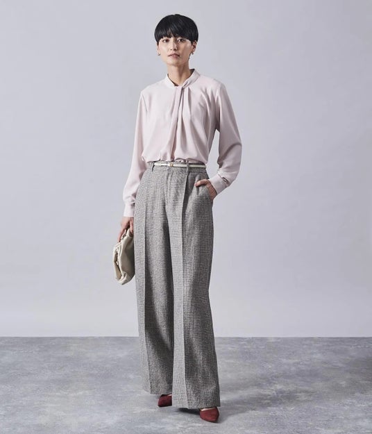 淡いピンク系のブラウスは、優しい印象を与えてくれます。ポリエステル100%ならシワになりにくく、きちんと感があり、お手入れも時短で済みます。