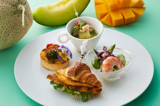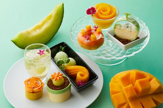 スイーツは、初夏の庭園をイメージした華やかな7種類をご用意いたしました。マンゴーバタークリームで作る花びらが美しい「マンゴーのタルトレット」は、タルトの中にもマンゴーペーストを忍ばせており、マンゴーの濃厚な味わいが感じられます。フレッシュメロンを挟んだ「マスクメロンショートケーキ」は鉢植えを模したユニークなビジュアルで登場。メロンの見た目が可愛らしい「メロンとココナッツのムース」にフレッシュマンゴーとオレンジソースが爽やかな「マンゴープリン オレンジソース」、すっきりとした味わいの「ヨーグルトのパンナコッタ メロンボールとミントのジュレ」など、マンゴーとメロンの魅力を存分に引き出したメニューの数々をご堪能ください。