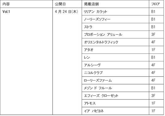 同館内の計30店舗からアイテムをピックアップ。最旬アイテムを集めた「Let's go out ~夏のはじまり~」は4月24日(木)より順次、B1三角広場および4Fプラザ前にてご覧いただけます。