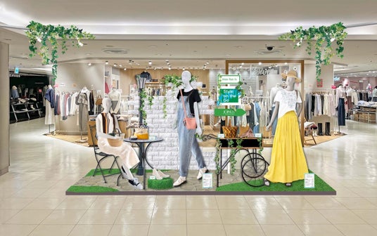 ジョイナスでは「Let's go out ~夏のはじまり~」と題し、初夏を彩るカラフルなファッションやアイテムを幅広くご紹介します。ホワイトのレンガパネルやグリーンの装飾などを施した、初夏らしい爽やかな街中をイメージした展示を展開。初夏のお出かけにぴったりなコーディネートやバッグ、シューズを提案いたします。